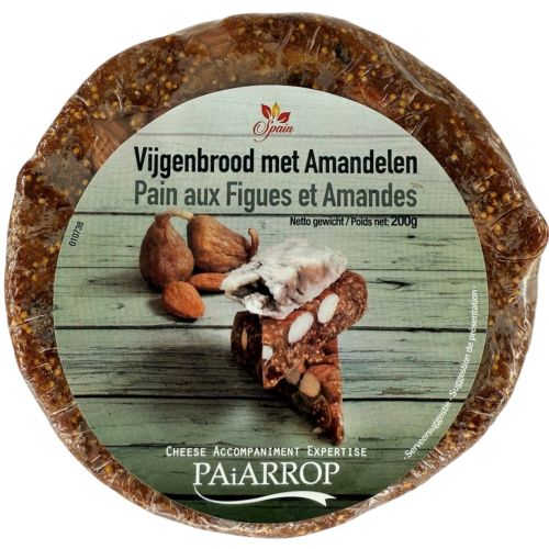 Fig bread with almonds from the PAiARROP brand, packaged by 200 gram. A deliciously sweet change, ideal for on the cheeseboard with drinks or as a dessert.