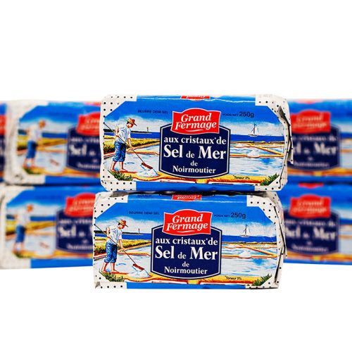 Grand Fermage aux cristaux'de Sel de Mer de Noirmoutier. Real soft French butter with small salt crystals exactly as it tastes in France.