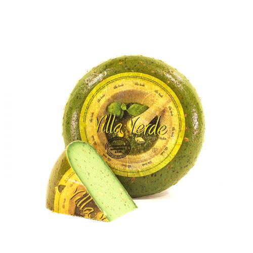 Delicious young mature cheese combined with delicious green pesto. With the addition of basil, pine nuts and garlic, this cheese wheel makes you feel like you are in the Mediterranean.